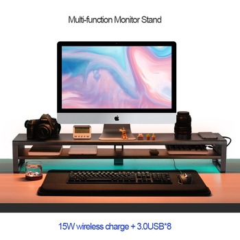 Usb3.0 डेस्क भंडारण आयोजक के साथ धातु मॉनिटर स्टैंड उठने हब और वायरलेस चार्जर